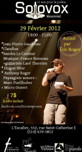 L’Escalier – le lieu d’un flux infini d’événements. Nous y avons vécu, vu et entendu de bonnes et de moins bonnes choses. Le prochain Solovox s’y tiendra le 29 février de 19h à 21h. 7$, une entrée, un livre et un CD. Ça c’est mettre de la pression sur «Amazon». L’événement compte deux parties. Éric Roger et ses invités nous convient à une soirée poésie-musique-slam.