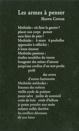 Le communiqué de presse – imprimé, avec tout la finesse propre aux éditions L’Oie de Cravan, sur un papier délicat – le disait d’emblée : après Jonquière LSD, le deuxième recueil de Shawn Cotton, Les armes à penser, paru il y a tout juste quelques jours, tisse certains liens de parenté avec la poésie de Denis Vanier ou de Geneviève Desrosiers. Vrai, comme chez ses auteurs canoniques d’une poésie de l’à côté, Shawn Cotton écrit les deux pieds bien ancrés dans le revers des choses. Chez lui comme chez eux apparaît une tentative de circonscription d’un état présent prosaïque, d’une mélancolie qui rit d’elle-même.